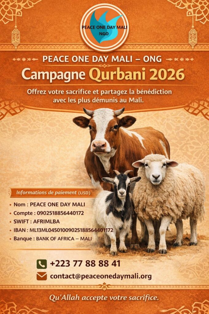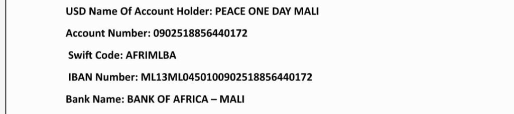 Peace One Day Mali est une organisation non gouvernementale créée en 2011, basée à Bamako, qui œuvre pour la promotion d’une paix durable et du développement communautaire au Mali. Elle met en œuvre des programmes dans les domaines de l’éducation, de la santé et de la nutrition, de la protection de l’enfance, de la sécurité alimentaire, de l’environnement, de l’aide humanitaire ainsi que de la consolidation de la paix et des droits humains.